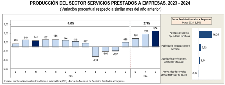 En marzo 2024, el sector servicios prestados a empresas registró un aumento de 3,54%, respecto al mismo mes del año anterior, explicado por tres de sus cuatros componentes: actividades profesionales, científicas y técnicas, agencias de viajes y operadores turísticos y publicidad e investigación de mercados. En contraste, disminuyeron las actividades de servicios administrativos y de apoyo.