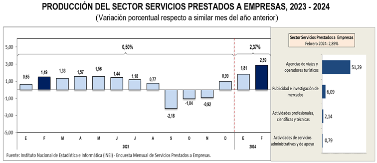En febrero de 2024, el sector servicios prestados a empresas se incrementó en 2,89%, respecto al mismo mes del año anterior, explicado por el crecimiento de sus cuatro componentes: actividades profesionales, científicas y técnicas; agencias de viajes y operadores turísticos; publicidad e investigación de mercados; y actividades de servicios administrativos y de apoyo.